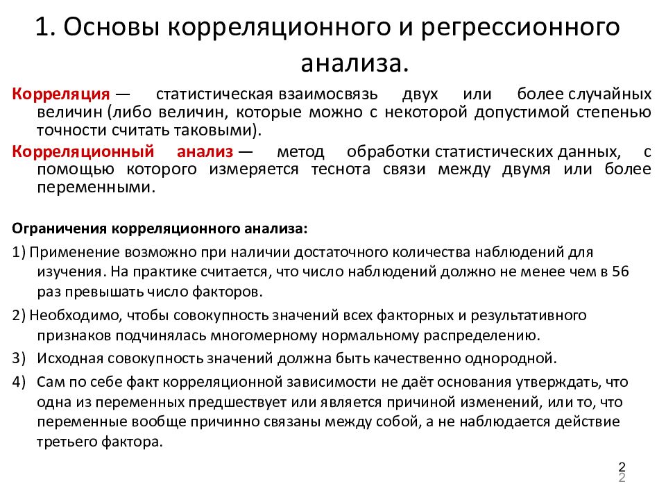 Корреляция — статистическая взаимосвязь двух или более случайных величин (либо величин, которые можно с некоторой допустимой степенью точности считать таковыми). Корреляционный анализ — метод обработки статистических данных, с помощью которого измеряется теснота связи между двумя или более переменными. Ограничения корреляционного анализа: 1) Применение возможно при наличии достаточного количества наблюдений для изучения. На практике считается, что число наблюдений должно не менее чем в 56 раз превышать число факторов. 2) Необходимо, чтобы совокупность значений всех факторных и результативного признаков подчинялась многомерному нормальному распределению. Исходная совокупность значений должна быть качественно однородной. Сам по себе факт корреляционной зависимости не даёт основания утверждать, что одна из переменных предшествует или является причиной изменений, или то, что переменные вообще причинно связаны между собой, а не наблюдается действие третьего фактора. 2 2