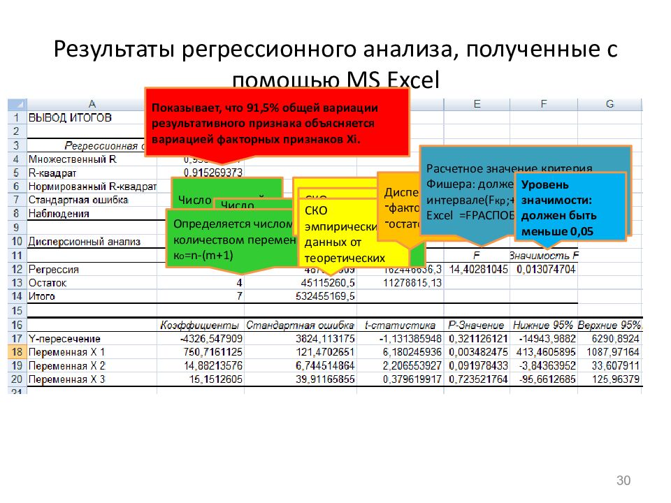 Слайд 30: Результаты регрессионного анализа, полученные с помощью MS Excel