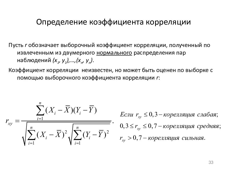 Пусть r обозначает выборочный коэффициент корреляции, полученный по извлеченным из двумерного нормального распределения пар наблюдений (x 1, y 1 ),…,(x n, y n ). Коэффициент корреляции неизвестен, но может быть оценен по выборке с помощью выборочного коэффициента корреляции r : 33