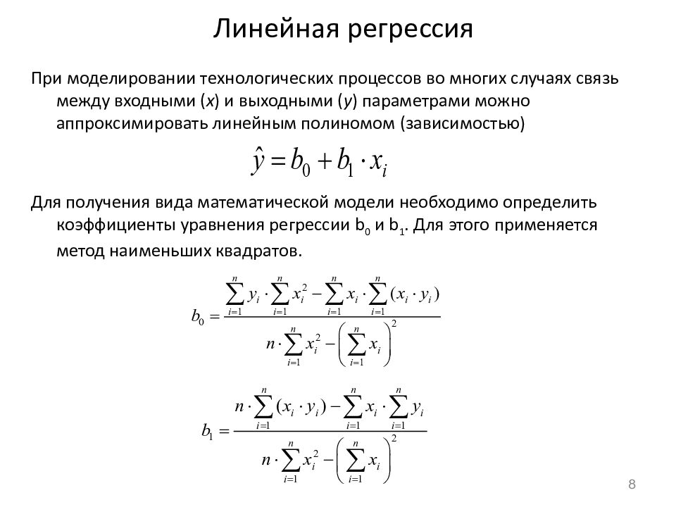 При моделировании технологических процессов во многих случаях связь между входными ( x ) и выходными ( y ) параметрами можно аппроксимировать линейным полиномом (зависимостью) Для получения вида математической модели необходимо определить коэффициенты уравнения регрессии b 0 и b 1. Для этого применяется метод наименьших квадратов. 8