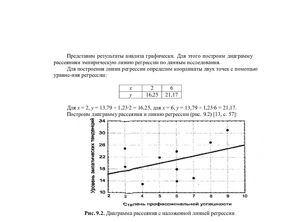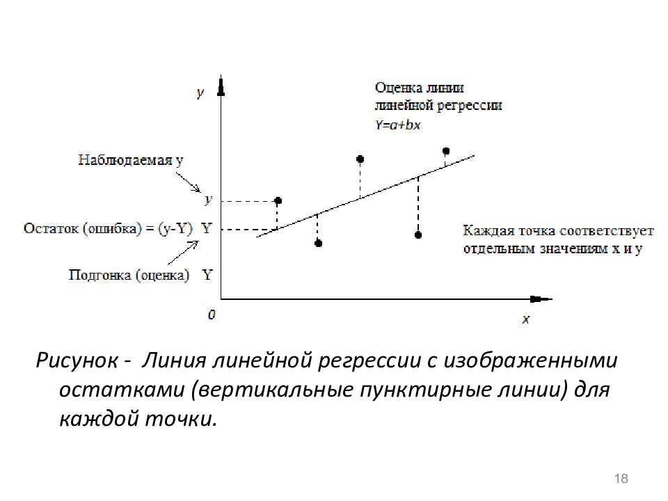 Рисунок - Линия линейной регрессии с изображенными остатками (вертикальные пунктирные линии) для каждой точки. 18
