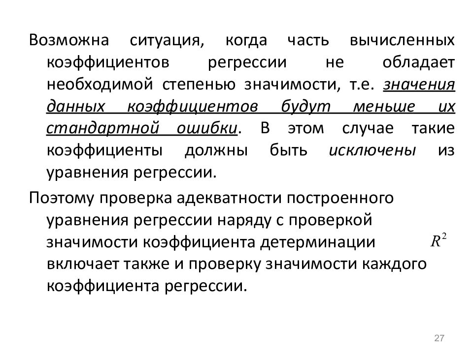 Возможна ситуация, когда часть вычисленных коэффициентов регрессии не обладает необходимой степенью значимости, т.е. значения данных коэффициентов будут меньше их стандартной ошибки. В этом случае такие коэффициенты должны быть исключены из уравнения регрессии. Поэтому проверка адекватности построенного уравнения регрессии наряду с проверкой значимости коэффициента детерминации включает также и проверку значимости каждого коэффициента регрессии. 27