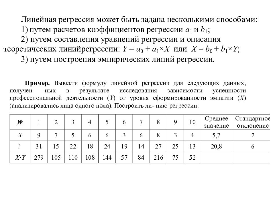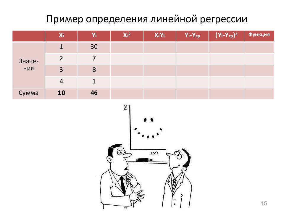 X i Y i X i 2 X i Y i Y i - Y ср ( Y i - Y ср ) 2 Функция Значе-ния 1 30 2 7 3 8 4 1 Сумма 10 46 15
