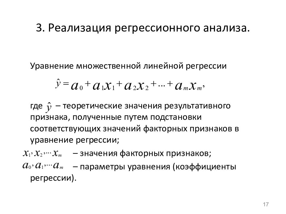 Уравнение множественной линейной регрессии где – теоретические значения результативного признака, полученные путем подстановки соответствующих значений факторных признаков в уравнение регрессии; – значения факторных признаков; – параметры уравнения (коэффициенты регрессии). 17