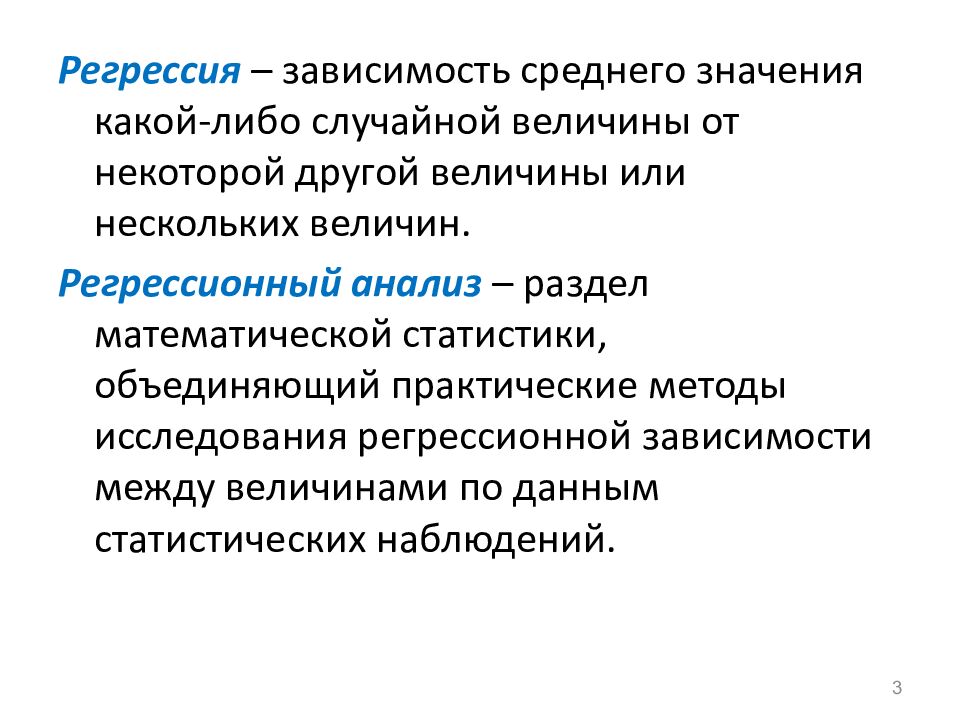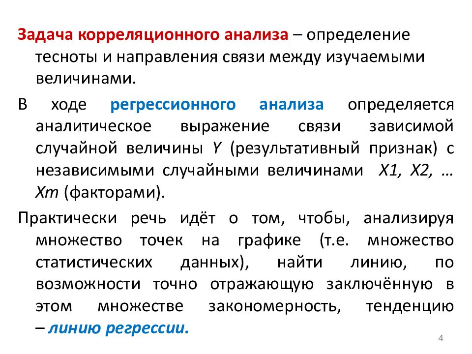 Регрессия – зависимость среднего значения какой-либо случайной величины от некоторой другой величины или нескольких величин. Регрессионный анализ – раздел математической статистики, объединяющий практические методы исследования регрессионной зависимости между величинами по данным статистических наблюдений. 3
