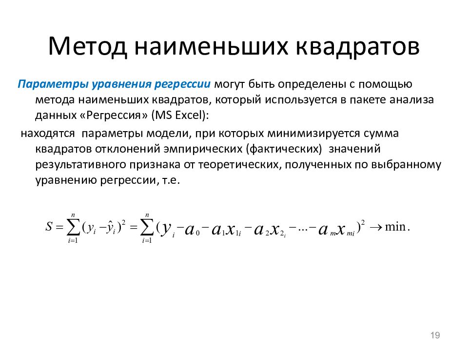 Параметры уравнения регрессии могут быть определены с помощью метода наименьших квадратов, который используется в пакете анализа данных «Регрессия» ( MS Excel ): находятся параметры модели, при которых минимизируется сумма квадратов отклонений эмпирических (фактических) значений результативного признака от теоретических, полученных по выбранному уравнению регрессии, т.е. 19