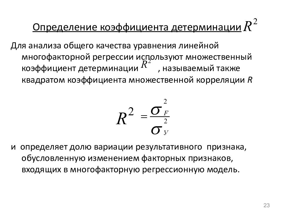 Для анализа общего качества уравнения линейной многофакторной регрессии используют множественный коэффициент детерминации, называемый также квадратом коэффициента множественной корреляции R и определяет долю вариации результативного признака, обусловленную изменением факторных признаков, входящих в многофакторную регрессионную модель. 23