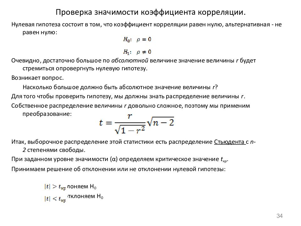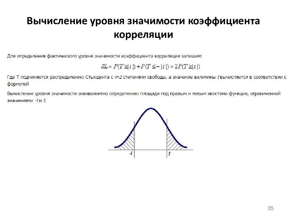 Нулевая гипотеза состоит в том, что коэффициент корреляции равен нулю, альтернативная - не равен нулю: Очевидно, достаточно большое по абсолютной величине значение величины r будет стремиться опровергнуть нулевую гипотезу. Возникает вопрос. Насколько большое должно быть абсолютное значение величины r ? Для того чтобы проверить гипотезу, мы должны знать распределение величины r. Собственное распределение величины r довольно сложное, поэтому мы применим преобразование: Итак, выборочное распределение этой статистики есть распределение Стьюдента с n-2 степенями свободы. При заданном уровне значимости (α) определяем критическое значение t кр. Принимаем решение об отклонении или не отклонении нулевой гипотезы: - отклоняем H 0 - не отклоняем H 0 34