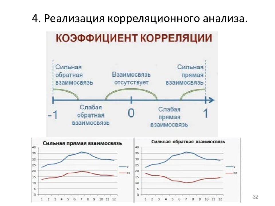 31 Значения используемые для построения регрессии Должна быть меньше, чем значение коэффициента Должен попадать в критическую область: (-∞; t кр ) U ( t кр ;+ ∞). Определяется: =СТЬЮДРАСПРОБР(0,05; n-k-1 ). t кр =2,78 Значение должно быть меньше уровня значимости 0,05 Показывает нижние и верхние границы доверительных интервалов. Не должен проходить через 0. Таким образом, регрессионная модель будет иметь вид: