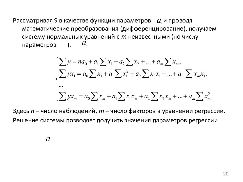 Рассматривая S в качестве функции параметров и проводя математические преобразования (дифференцирование), получаем систему нормальных уравнений с m неизвестными (по числу параметров ). Здесь n – число наблюдений, m – число факторов в уравнении регрессии. Решение системы позволяет получить значения параметров регрессии. 20