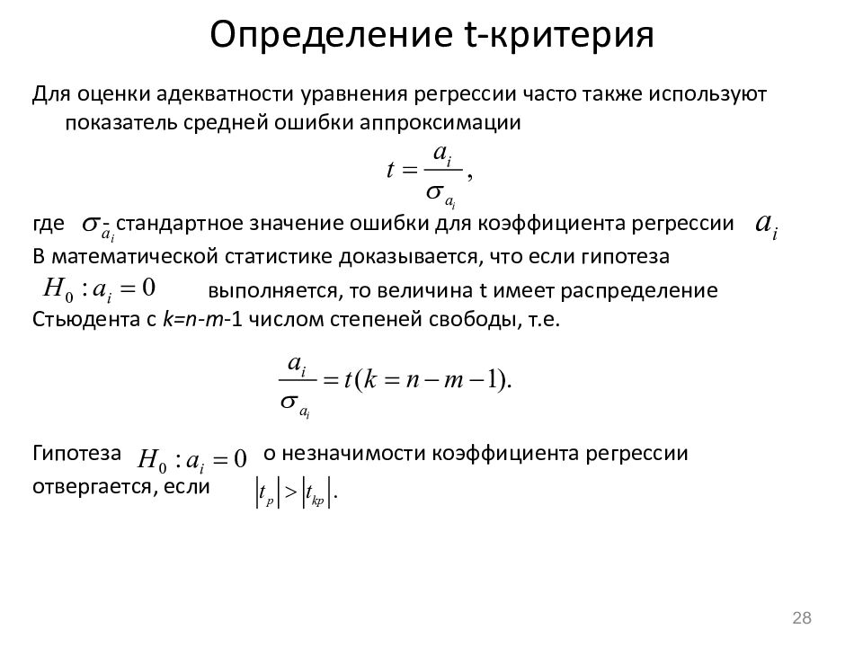 Для оценки адекватности уравнения регрессии часто также используют показатель средней ошибки аппроксимации где - стандартное значение ошибки для коэффициента регрессии В математической статистике доказывается, что если гипотеза выполняется, то величина t имеет распределение Стьюдента с k=n-m -1 числом степеней свободы, т.е. Гипотеза о незначимости коэффициента регрессии отвергается, если 28