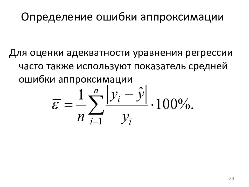 Для оценки адекватности уравнения регрессии часто также используют показатель средней ошибки аппроксимации 26