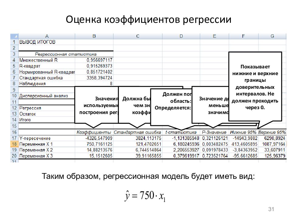 30 Число степеней свободы Число факторных признаков к ф = m Определяется числом наблюдений и количеством переменных в уравнении к о = n-(m+1) Сумма квадратов отклонений (СКО) СКО теоретических данных от среднего СКО эмпирических данных от теоретических Дисперсии: факторная; остаточная. Расчетное значение критерия Фишера: должен быть в интервале( F кр ;+ ∞), определяется в Excel = F РАСПОБР(0,05;к п ;к о ) Уровень значимости: должен быть меньше 0,05 Показывает, что 91,5% общей вариации результативного признака объясняется вариацией факторных признаков Х i.