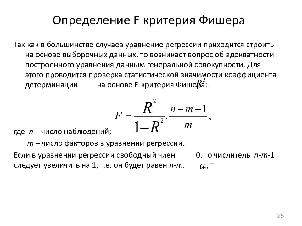 Так как в большинстве случаев уравнение регрессии приходится строить на основе выборочных данных, то возникает вопрос об адекватности построенного уравнения данным генеральной совокупности. Для этого проводится проверка статистической значимости коэффициента детерминации на основе F -критерия Фишера: где n – число наблюдений; m – число факторов в уравнении регрессии. Если в уравнении регрессии свободный член 0, то числитель n-m -1 следует увеличить на 1, т.е. он будет равен n-m. 25