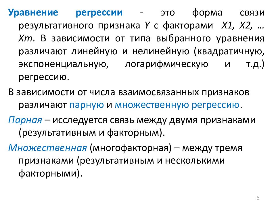 Уравнение регрессии - это форма связи результативного признака Y с факторами Х1, Х2, …Х m. В зависимости от типа выбранного уравнения различают линейную и нелинейную (квадратичную, экспоненциальную, логарифмическую и т.д.) регрессию. В зависимости от числа взаимосвязанных признаков различают парную и множественную регрессию. Парная – исследуется связь между двумя признаками (результативным и факторным). Множественная (многофакторная) – между тремя признаками (результативным и несколькими факторными). 5