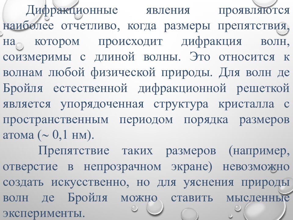 Дифракционные явления проявляются наиболее отчетливо, когда размеры препятствия, на котором происходит дифракция волн, соизмеримы с длиной волны. Это относится к волнам любой физической природы. Для волн де Бройля естественной дифракционной решеткой является упорядоченная структура кристалла с пространственным периодом порядка размеров атома ( 0,1 нм). Препятствие таких размеров (например, отверстие в непрозрачном экране) невозможно создать искусственно, но для уяснения природы волн де Бройля можно ставить мысленные эксперименты.