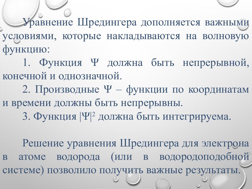 Уравнение Шредингера дополняется важными условиями, которые накладываются на волновую функцию: 1. Функция Ψ должна быть непрерывной, конечной и однозначной. 2. Производные Ψ – функции по координатам и времени должны быть непрерывны. 3. Функция |Ψ| 2 должна быть интегрируема. Решение уравнения Шредингера для электрона в атоме водорода (или в водородоподобной системе) позволило получить важные результаты.