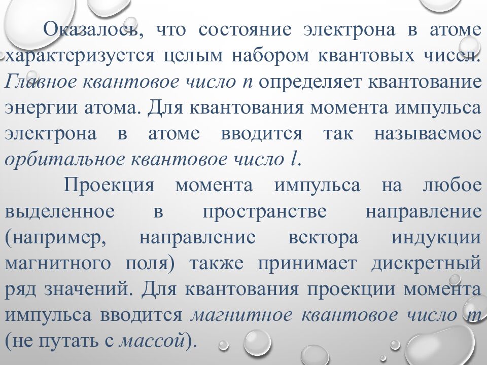 Оказалось, что состояние электрона в атоме характеризуется целым набором квантовых чисел. Главное квантовое число n определяет квантование энергии атома. Для квантования момента импульса электрона в атоме вводится так называемое орбитальное квантовое число l. Проекция момента импульса на любое выделенное в пространстве направление (например, направление вектора индукции магнитного поля) также принимает дискретный ряд значений. Для квантования проекции момента импульса вводится магнитное квантовое число m (не путать с массой ).