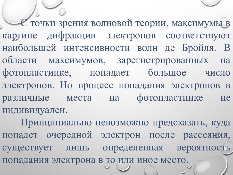 С точки зрения волновой теории, максимумы в картине дифракции электронов соответствуют наибольшей интенсивности волн де Бройля. В области максимумов, зарегистрированных на фотопластинке, попадает большое число электронов. Но процесс попадания электронов в различные места на фотопластинке не индивидуален. Принципиально невозможно предсказать, куда попадет очередной электрон после рассеяния, существует лишь определенная вероятность попадания электрона в то или иное место.