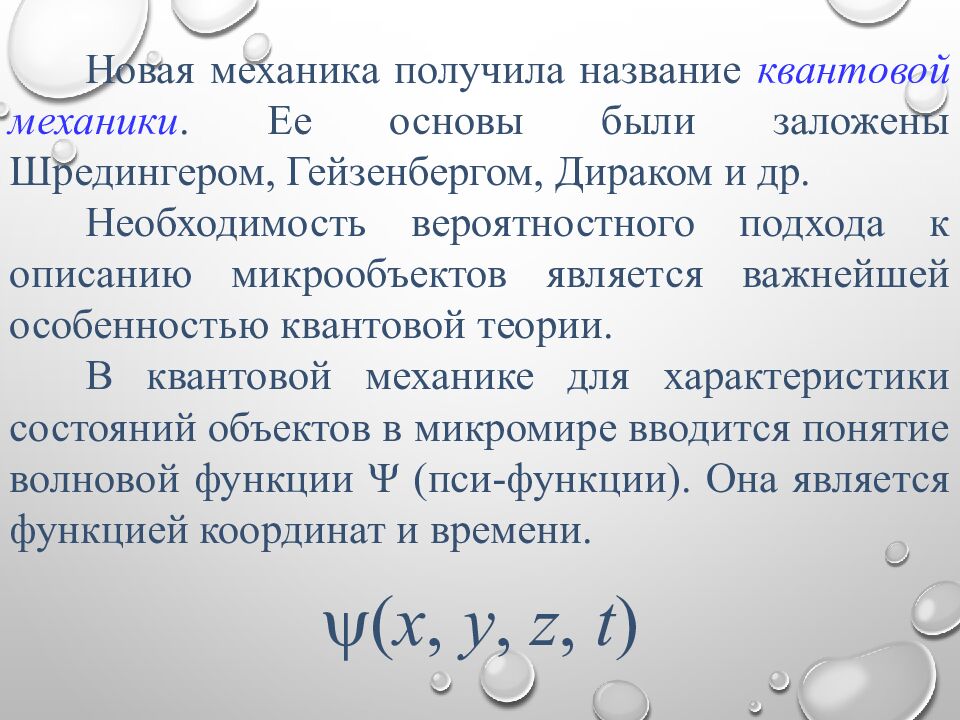 Новая механика получила название квантовой механики. Ее основы были заложены Шредингером, Гейзенбергом, Дираком и др. Необходимость вероятностного подхода к описанию микрообъектов является важнейшей особенностью квантовой теории. В квантовой механике для характеристики состояний объектов в микромире вводится понятие волновой функции Ψ (пси-функции). Она является функцией координат и времени. ( х, у, z, t )