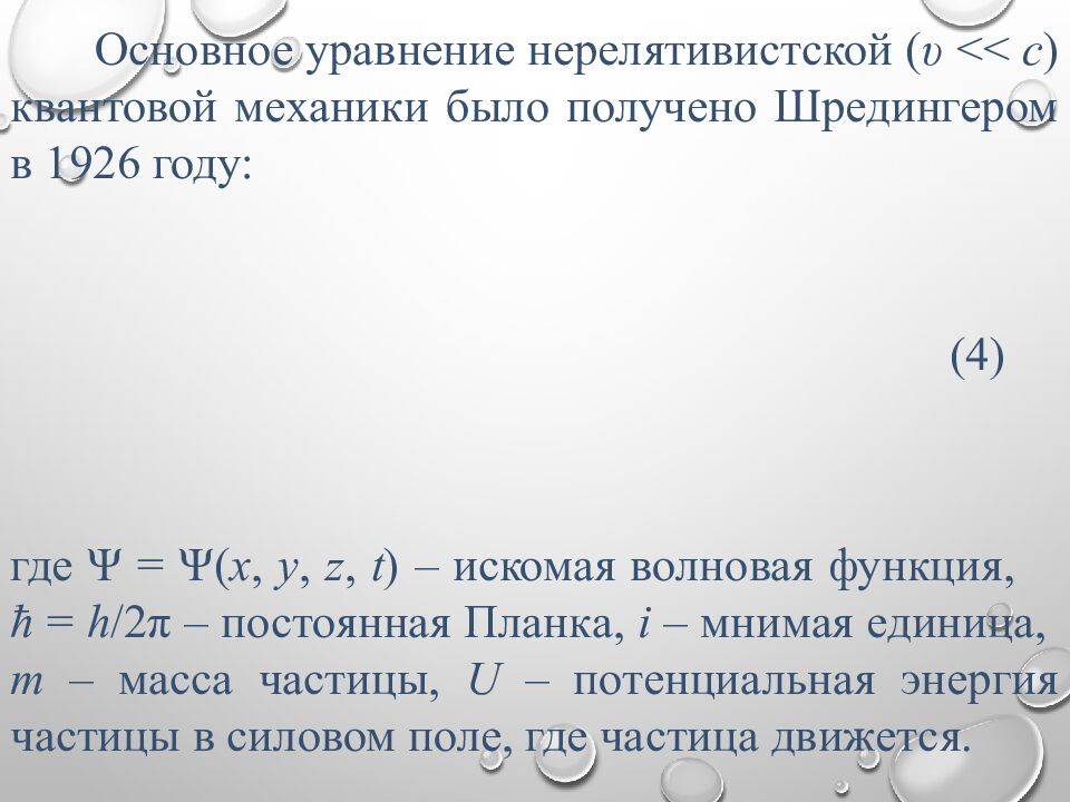 Основное уравнение нерелятивистской ( υ << c ) квантовой механики было получено Шредингером в 1926 году: (4) где Ψ = Ψ( x, y, z, t ) – искомая волновая функция, ħ = h /2π – постоянная Планка, i – мнимая единица, m – масса частицы, U – потенциальная энергия частицы в силовом поле, где частица движется.