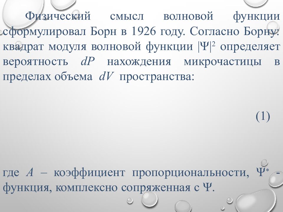 Физический смысл волновой функции сформулировал Борн в 1926 году. Согласно Борну: квадрат модуля волновой функции |Ψ| 2 определяет вероятность dP нахождения микрочастицы в пределах объема dV пространства: (1) где A – коэффициент пропорциональности, Ψ - функция, комплексно сопряженная с Ψ.
