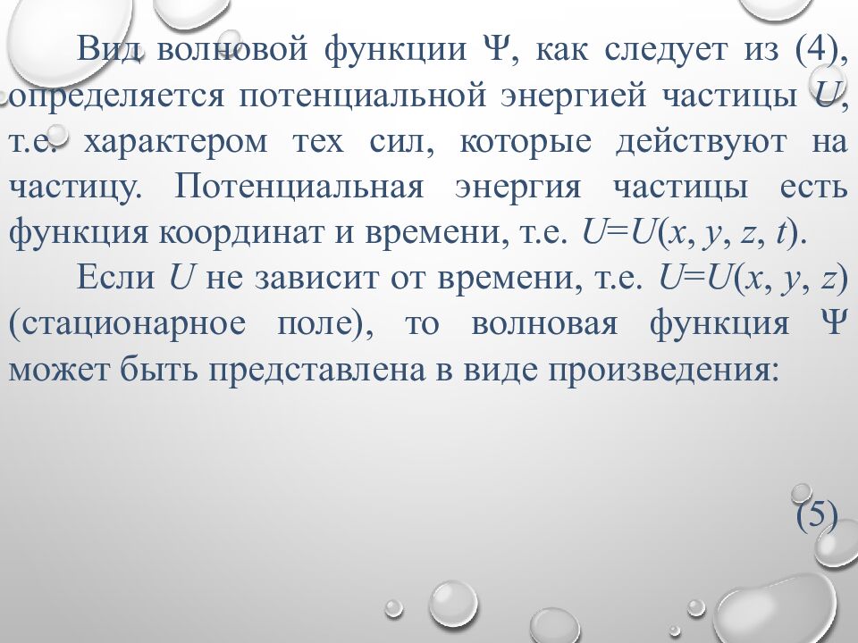 Вид волновой функции Ψ, как следует из (4), определяется потенциальной энергией частицы U, т.е. характером тех сил, которые действуют на частицу. Потенциальная энергия частицы есть функция координат и времени, т.е. U = U ( x, y, z, t ). Если U не зависит от времени, т.е. U = U ( x, y, z ) (стационарное поле), то волновая функция Ψ может быть представлена в виде произведения: (5)