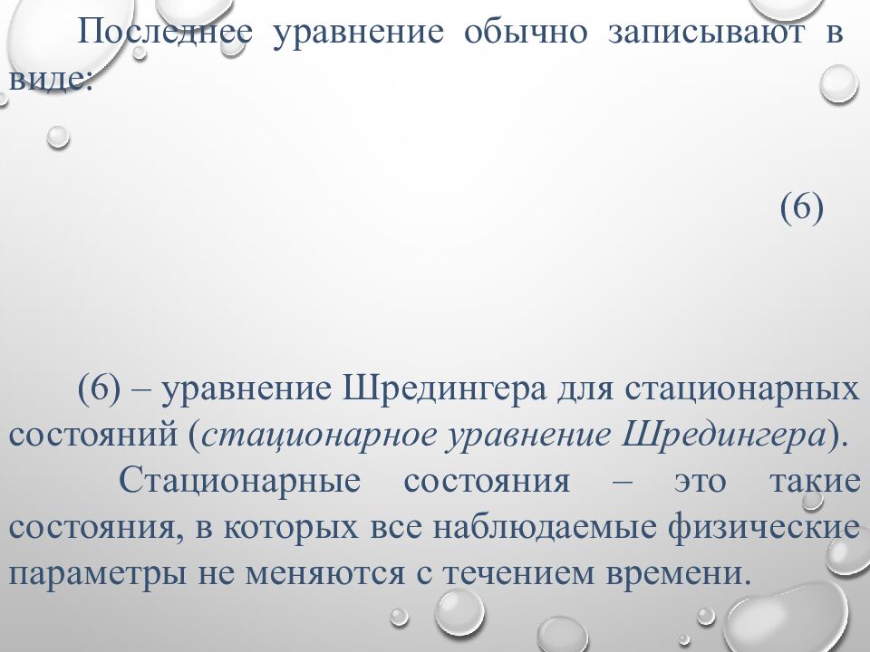 Последнее уравнение обычно записывают в виде: (6) (6) – уравнение Шредингера для стационарных состояний ( стационарное уравнение Шредингера ). Стационарные состояния – это такие состояния, в которых все наблюдаемые физические параметры не меняются с течением времени.
