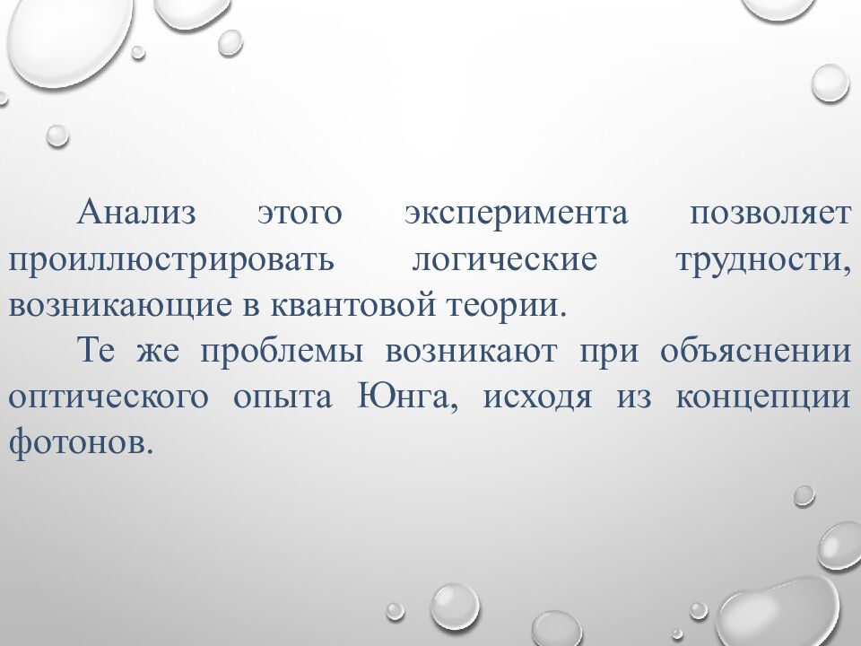 Анализ этого эксперимента позволяет проиллюстрировать логические трудности, возникающие в квантовой теории. Те же проблемы возникают при объяснении оптического опыта Юнга, исходя из концепции фотонов.