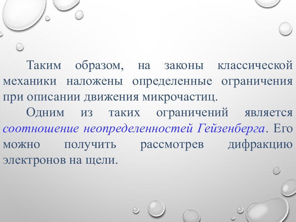 Таким образом, на законы классической механики наложены определенные ограничения при описании движения микрочастиц. Одним из таких ограничений является соотношение неопределенностей Гейзенберга. Его можно получить рассмотрев дифракцию электронов на щели.