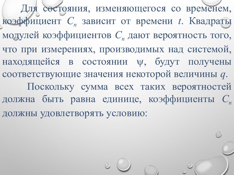 Для состояния, изменяющегося со временем, коэффициент С n зависит от времени t. Квадраты модулей коэффициентов С n дают вероятность того, что при измерениях, производимых над системой, находящейся в состоянии , будут получены соответствующие значения некоторой величины q. Поскольку сумма всех таких вероятностей должна быть равна единице, коэффициенты С n должны удовлетворять условию: