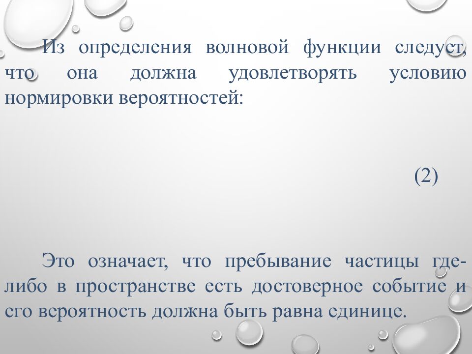 Из определения волновой функции следует, что она должна удовлетворять условию нормировки вероятностей: Это означает, что пребывание частицы где-либо в пространстве есть достоверное событие и его вероятность должна быть равна единице. (2)