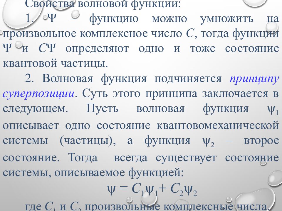 Свойства волновой функции: 1. Ψ – функцию можно умножить на произвольное комплексное число C, тогда функции Ψ и C Ψ определяют одно и тоже состояние квантовой частицы. 2. Волновая функция подчиняется принципу суперпозиции. Суть этого принципа заключается в следующем. Пусть волновая функция 1 описывает одно состояние квантовомеханической системы (частицы), а функция 2 – второе состояние. Тогда всегда существует состояние системы, описываемое функцией: = С 1 1 + С 2 2 где С 1 и С 2 произвольные комплексные числа.