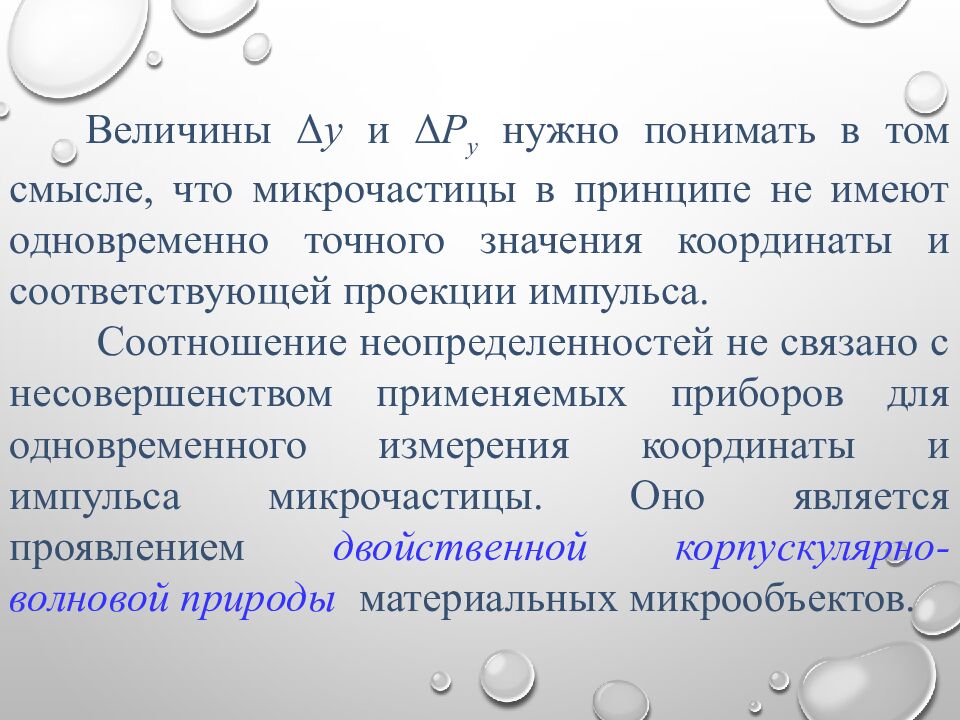 Величины Δ y и Δ P y нужно понимать в том смысле, что микрочастицы в принципе не имеют одновременно точного значения координаты и соответствующей проекции импульса. Соотношение неопределенностей не связано с несовершенством применяемых приборов для одновременного измерения координаты и импульса микрочастицы. Оно является проявлением двойственной корпускулярно-волновой природы материальных микрообъектов.