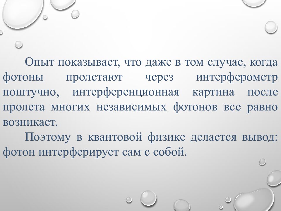 Опыт показывает, что даже в том случае, когда фотоны пролетают через интерферометр поштучно, интерференционная картина после пролета многих независимых фотонов все равно возникает. Поэтому в квантовой физике делается вывод: фотон интерферирует сам с собой.
