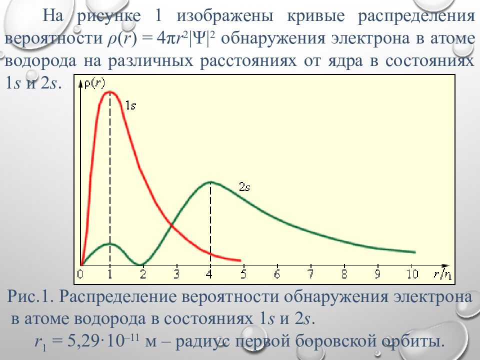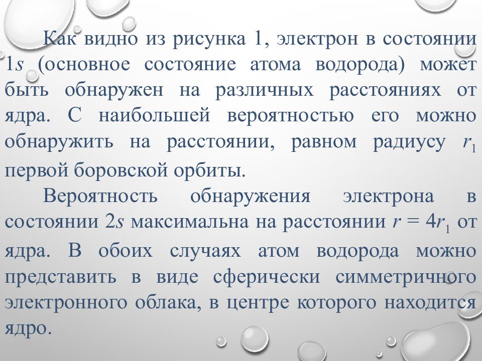Как видно из рисунка 1, электрон в состоянии 1 s (основное состояние атома водорода) может быть обнаружен на различных расстояниях от ядра. С наибольшей вероятностью его можно обнаружить на расстоянии, равном радиусу r 1 первой боровской орбиты. Вероятность обнаружения электрона в состоянии 2 s максимальна на расстоянии r = 4 r 1 от ядра. В обоих случаях атом водорода можно представить в виде сферически симметричного электронного облака, в центре которого находится ядро.