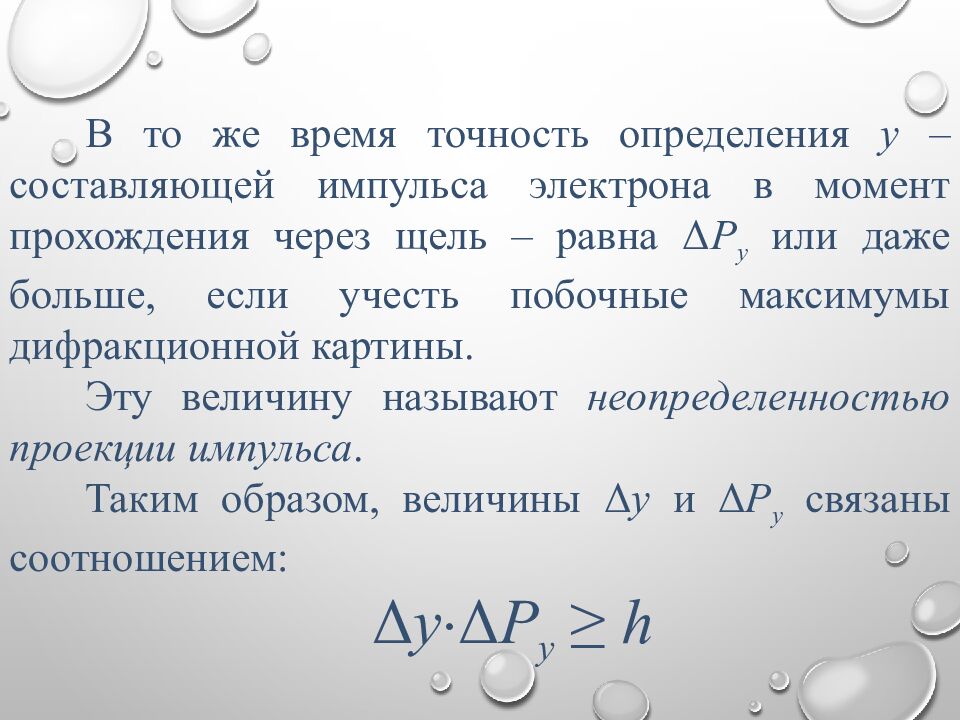 В то же время точность определения y – составляющей импульса электрона в момент прохождения через щель – равна Δ P y или даже больше, если учесть побочные максимумы дифракционной картины. Эту величину называют неопределенностью проекции импульса. Таким образом, величины Δ y и Δ P y связаны соотношением: Δ y Δ P y ≥ h
