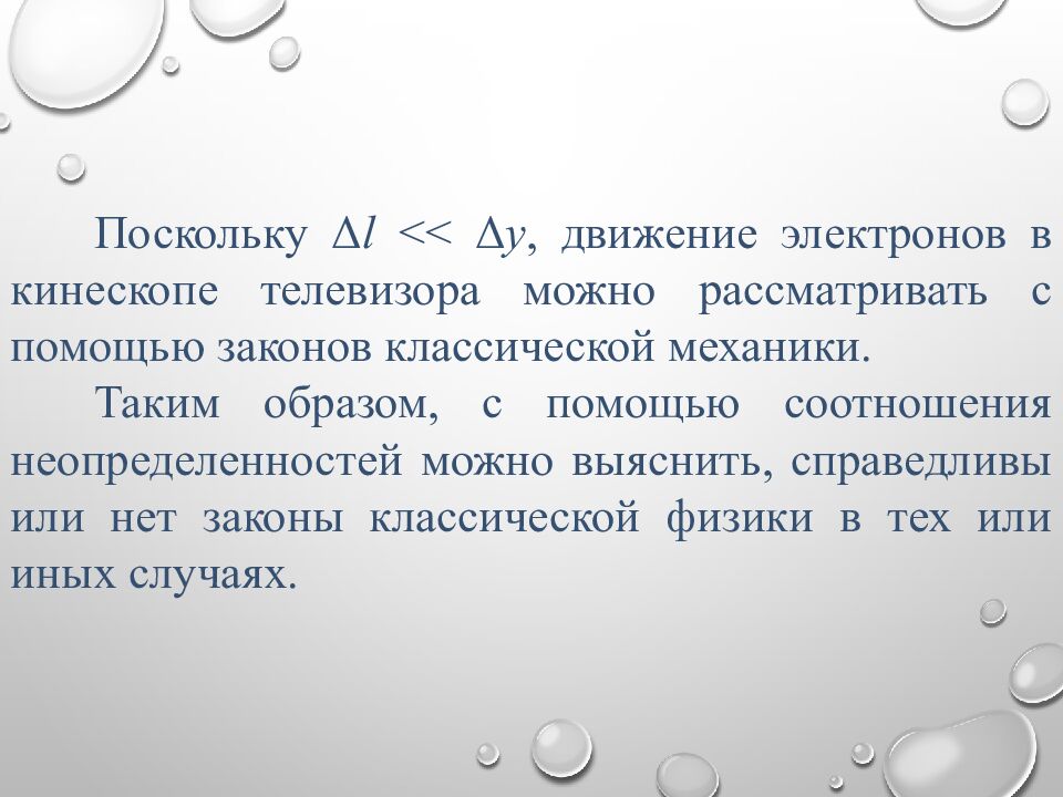 Поскольку Δ l << Δ y, движение электронов в кинескопе телевизора можно рассматривать с помощью законов классической механики. Таким образом, с помощью соотношения неопределенностей можно выяснить, справедливы или нет законы классической физики в тех или иных случаях.