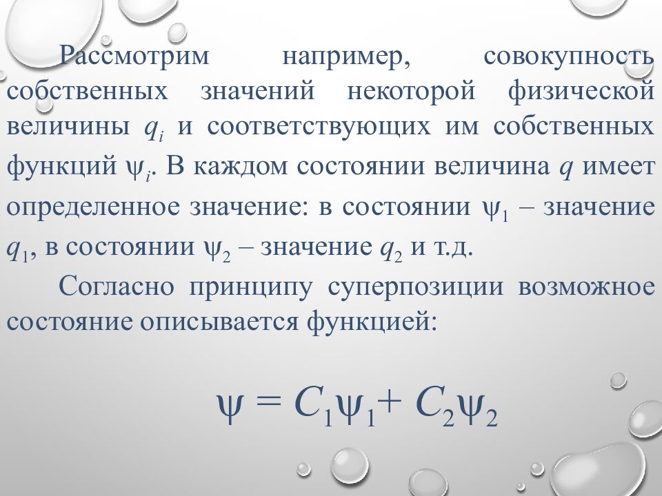 Рассмотрим например, совокупность собственных значений некоторой физической величины q i и соответствующих им собственных функций i. В каждом состоянии величина q имеет определенное значение: в состоянии 1 – значение q 1, в состоянии 2 – значение q 2 и т.д. Согласно принципу суперпозиции возможное состояние описывается функцией: = С 1 1 + С 2 2