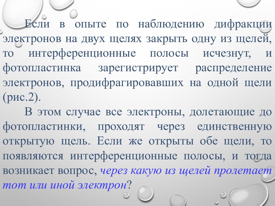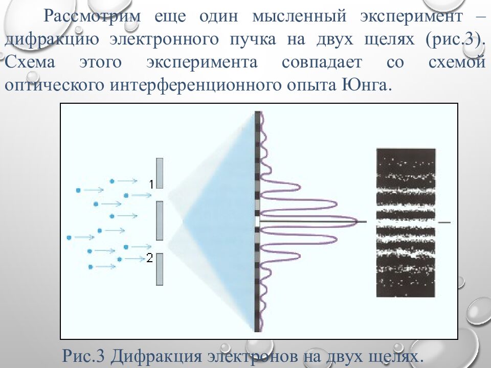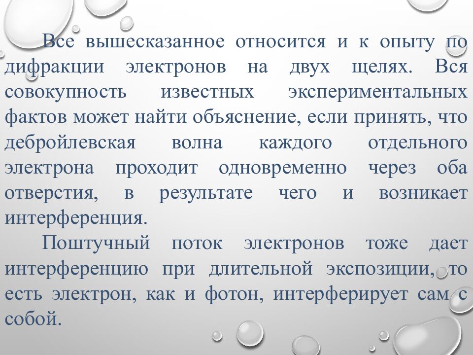 Все вышесказанное относится и к опыту по дифракции электронов на двух щелях. Вся совокупность известных экспериментальных фактов может найти объяснение, если принять, что дебройлевская волна каждого отдельного электрона проходит одновременно через оба отверстия, в результате чего и возникает интерференция. Поштучный поток электронов тоже дает интерференцию при длительной экспозиции, то есть электрон, как и фотон, интерферирует сам с собой.