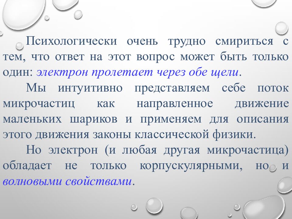 Психологически очень трудно смириться с тем, что ответ на этот вопрос может быть только один: электрон пролетает через обе щели. Мы интуитивно представляем себе поток микрочастиц как направленное движение маленьких шариков и применяем для описания этого движения законы классической физики. Но электрон (и любая другая микрочастица) обладает не только корпускулярными, но и волновыми свойствами.