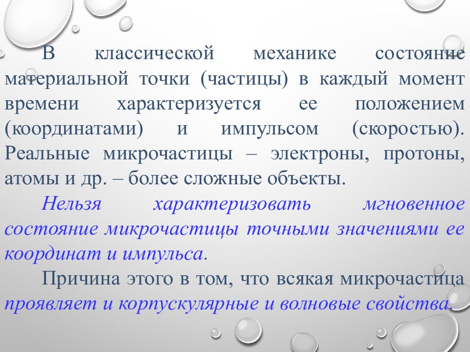 В классической механике состояние материальной точки (частицы) в каждый момент времени характеризуется ее положением (координатами) и импульсом (скоростью). Реальные микрочастицы – электроны, протоны, атомы и др. – более сложные объекты. Нельзя характеризовать мгновенное состояние микрочастицы точными значениями ее координат и импульса. Причина этого в том, что всякая микрочастица проявляет и корпускулярные и волновые свойства.