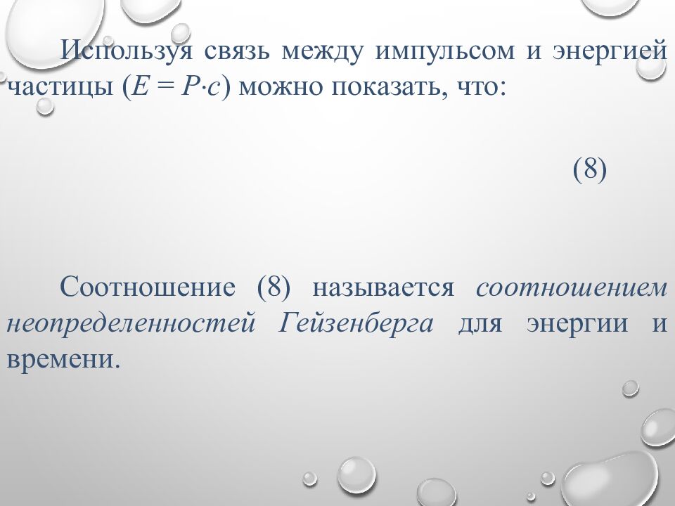 Используя связь между импульсом и энергией частицы ( E = P c ) можно показать, что: (8) Соотношение (8) называется соотношением неопределенностей Гейзенберга для энергии и времени.