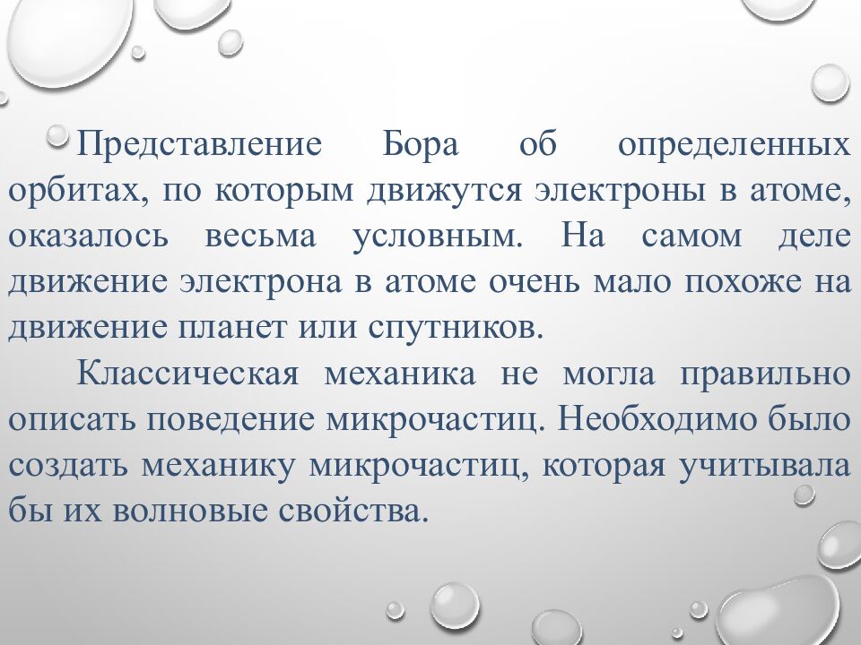 Представление Бора об определенных орбитах, по которым движутся электроны в атоме, оказалось весьма условным. На самом деле движение электрона в атоме очень мало похоже на движение планет или спутников. Классическая механика не могла правильно описать поведение микрочастиц. Необходимо было создать механику микрочастиц, которая учитывала бы их волновые свойства.