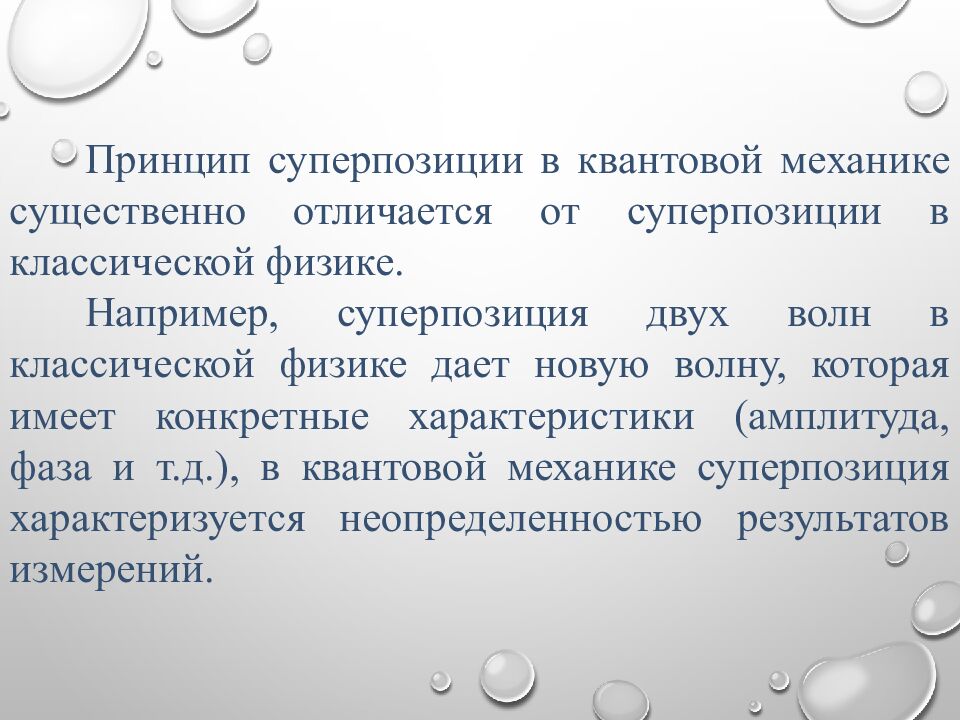 Принцип суперпозиции в квантовой механике существенно отличается от суперпозиции в классической физике. Например, суперпозиция двух волн в классической физике дает новую волну, которая имеет конкретные характеристики (амплитуда, фаза и т.д.), в квантовой механике суперпозиция характеризуется неопределенностью результатов измерений.