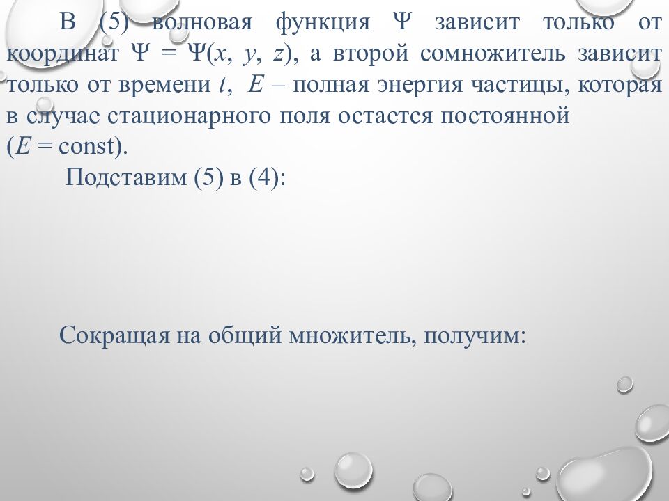 В (5) волновая функция Ψ зависит только от координат Ψ = Ψ( x, y, z ), а второй сомножитель зависит только от времени t, E – полная энергия частицы, которая в случае стационарного поля остается постоянной ( E = const ). Подставим (5) в (4): Сокращая на общий множитель, получим: