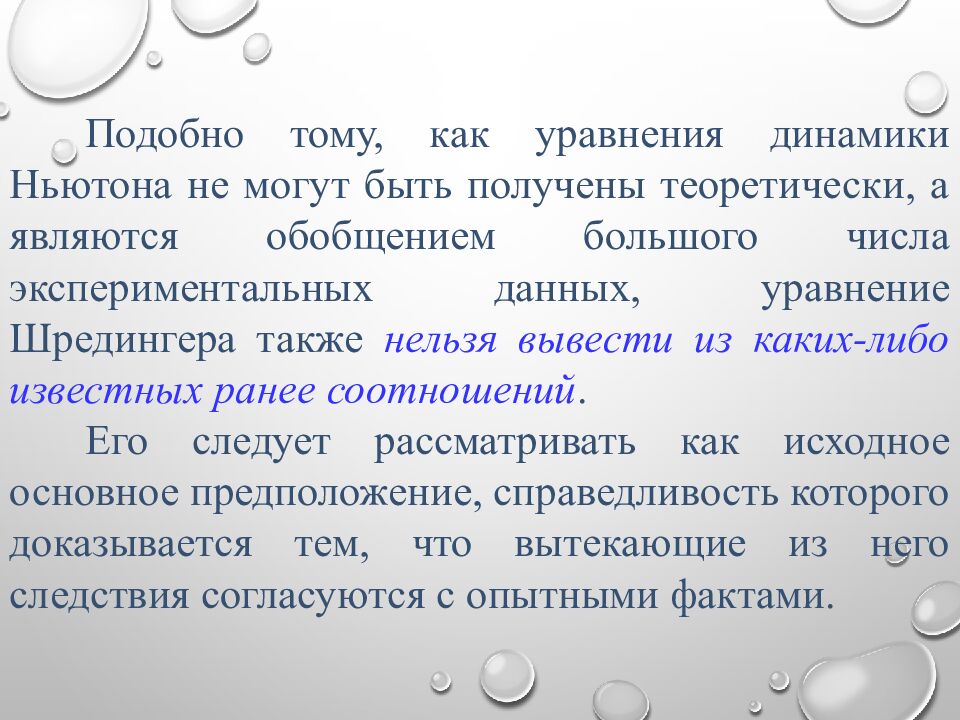 Подобно тому, как уравнения динамики Ньютона не могут быть получены теоретически, а являются обобщением большого числа экспериментальных данных, уравнение Шредингера также нельзя вывести из каких-либо известных ранее соотношений. Его следует рассматривать как исходное основное предположение, справедливость которого доказывается тем, что вытекающие из него следствия согласуются с опытными фактами.