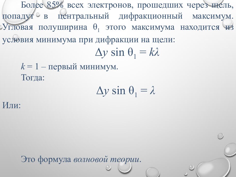 Более 85% всех электронов, прошедших через щель, попадут в центральный дифракционный максимум. Угловая полуширина θ 1 этого максимума находится из условия минимума при дифракции на щели: Δ y sin θ 1 = kλ k = 1 – первый минимум. Тогда: Δ y sin θ 1 = λ Или: Это формула волновой теории.