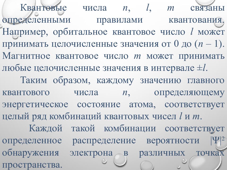 Квантовые числа n, l, m связаны определенными правилами квантования. Например, орбитальное квантовое число l может принимать целочисленные значения от 0 до ( n – 1). Магнитное квантовое число m может принимать любые целочисленные значения в интервале ± l. Таким образом, каждому значению главного квантового числа n, определяющему энергетическое состояние атома, соответствует целый ряд комбинаций квантовых чисел l и m. Каждой такой комбинации соответствует определенное распределение вероятности |Ψ| 2 обнаружения электрона в различных точках пространства.