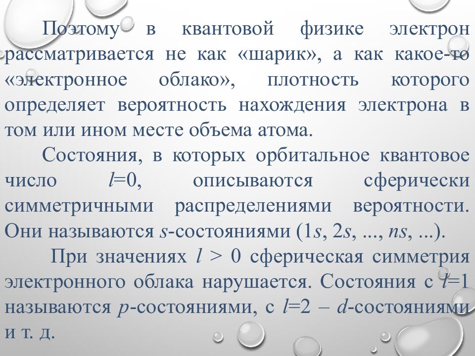 Поэтому в квантовой физике электрон рассматривается не как «шарик», а как какое-то «электронное облако», плотность которого определяет вероятность нахождения электрона в том или ином месте объема атома. Состояния, в которых орбитальное квантовое число l =0, описываются сферически симметричными распределениями вероятности. Они называются s -состояниями (1 s, 2 s,..., ns,...). При значениях l > 0 сферическая симметрия электронного облака нарушается. Состояния с l =1 называются p -состояниями, с l =2 – d -состояниями и т. д.
